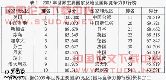 2004年我国全年进出口总额达 11548亿美元,顺差320亿美元,成为仅次于美国、日本之后的第三贸易大国。但与此同时近年来我国国际竞争力却有所下滑。瑞士洛桑国际管院(IMD对世界 51个国家和 9个地区进行综合评定的结果显示,国际竞争力排名由 2004年的第 2位降至第 3l位。世界经济发布的《2005至2006年全球竞争力报告》中显示中国排名第 49也较去年下降了3个位次(如表 1)。