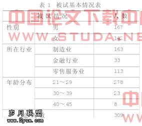 3.研究对象。本研究的被试是取自广州、东莞和佛山三个城市的7个不同企业、不同部门的中基层员工。行业包括制造业、零售服务业和行业。被试年龄在21至45岁,样本量309,其中男性167名,女性142名。