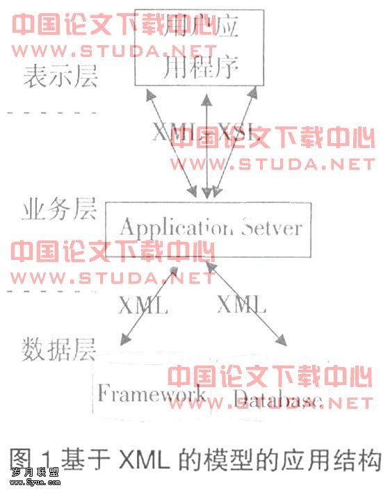 本系统采用客户/服务器三层架构,如图1所示。各个异构数据库资源构成了系统数据层;本系统完成的主要任务,即异构数据集成和查询的功能被封装构成业务层,并使用XSL将XML转换成指定格式的文本;用户的应用构成系统的表示层。