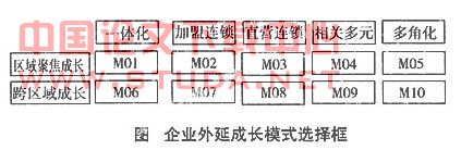 事物的发展包括质量和数量两个方面,企业成长也不例外。企业从小到大的演变过程就是企业规模(数量)和企业竞争力(质量)不断成长的过程。因此,本文从质量和数量两个角度对企业成长的基本模式进行了分类研究。在外延成长模式选择方面,本文归纳为一体化、加盟连锁、直营连锁、相关多元化及多角化集中模式,各种模式再结合空间进行分析,这样企业外延成长的可能模式就可以归纳为下图。