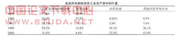 在国有企业改革不断深入的同时,非国有和非公有经济以更快的速度发展,从而形成了以公有制为主体、多种所有制经济共同发展的社会主义初级阶段基本经济制度。中国社科院经济研究所的一份研究报告中曾列举1978—2004年我国工业总产值中各类所有制经济的比重,情况如下表: