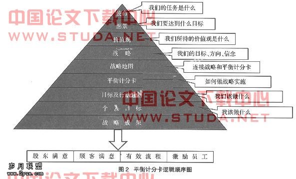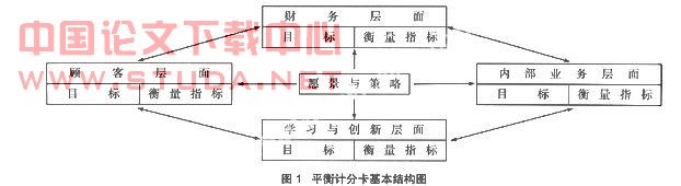 通过图1所示,我们可以清楚、直观地了解平衡计分卡的基本结构。平衡计分卡衡量系统包含财务层面、客户层面、学习与创新层面、内部业务流程层面的四个层面: