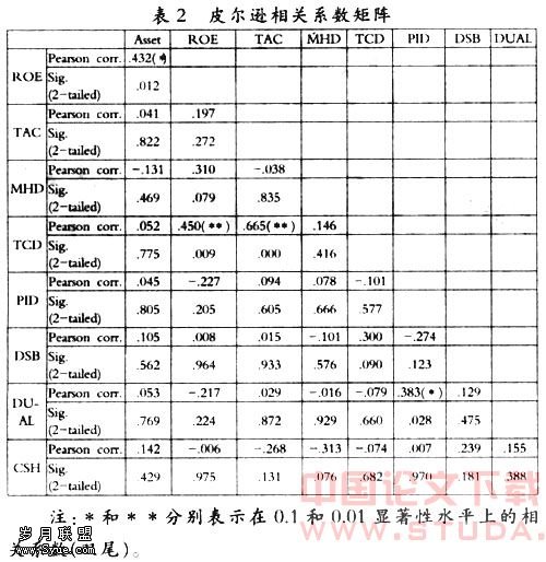 (2)净资产收益率与独立董事比重、两职设置状况之间均呈弱负相关关系;而总资产规模与4个控制变量之间均呈较弱的正相关关系。