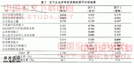 因子分析的目的是用少量因子代替多个原始变量,选择提取多少个因子由本组选择项 决定。采用主成分分析法对问卷中有关影响进入方式的11项问卷项目进行因子分析,根 据因子的旋转方式(varimax),提取Eigen值超过1的三个因子(见表3)。这三个因子的负 荷值,分别反映进入方式的影响因素的特征。所以命名<因子1>为财务,命名<因子2>为 技术,命名<因子3>为营销。