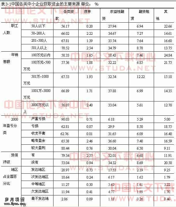 从企业资金主要来源的各类金融机构的贷款来分析,其特征如下:一是各类贷款向盈利较大的、参加过信用评级的、营业额高的和规模较大的企业倾斜,这些企业所获贷款的比重分别占到80.4%,79.3%、76.1%和70.5%,大大高于平均值;二是各类贷款明显向发达地区集中,发达和次发达地区企业各类贷款占全国份额的60.3%,不发达和欠发达地区企业进展22.5%;三是严重亏损企业的资金来源竟有高达90%是贷款,这势必加大金融机构向中小企业贷款的风险,值得加以关注。