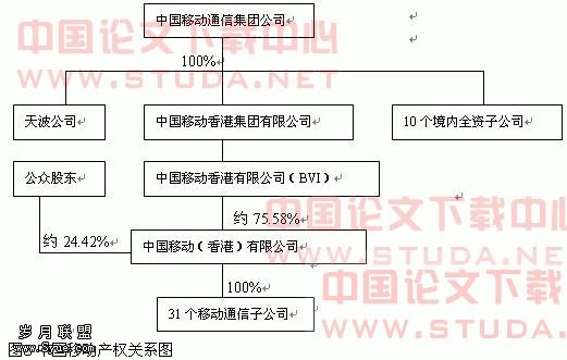 中国移动通信集团公司是在原中国邮电电信总局移动通信资产整体剥离的基础上组建的特大型国有通信。1999年3月开始筹建,2000年4月宣布成立,5月16日正式挂牌。集团公司主要经营移动通信业务以及与移动通信业务相关的系统集成、漫游结算清算、技术开发等业务。集团公司注册资本518亿元。到目前为止,中国移动通信集团公司的产权关系图如图8: