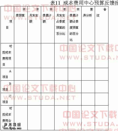 预算反馈报告构成了中国移动预算监控体系的重要组成部分。其预算反馈报告分为成本费用中心预算反馈报告、收入中心预算反馈报告、利润中心预算反馈报告、投资中心预算反馈报告。预算反馈报告可以反映预算执行情况,分析偏差原因,采取修正措施,在经本单位预算管理工作组审议,并经该预算单位第一负责人签字后,报上一级预算管理单位,作为预算考核的基本依据。成本费用中心的预算反馈报告如表12。