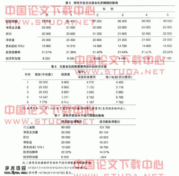从表5中可看出:无形资产支出当期费用化与资本化并摊销两种方法最终能实现相同的净收益(22 000元),但后者却能使变化更平稳、渐进。再从投资报酬率和经济附加值指标来看,这两种方法却产生了不同效果:前者使企业在收益平稳时期到来前处于不利地位,此后又产生一个比实际要高的投资报酬率和经济附加值指标;而后者则真实地反映了企业盈利能力。