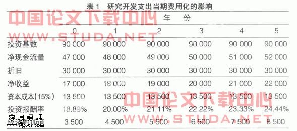 从表1中可看出:在收益平稳期(第3年,支出和收入均为3 000元),企业盈利能力反映了真实水平;之前,企业盈利能力被低估;之后被高估。后期较高的盈利能力源于先前的被低估,即绝大部分有关无形资产的支出均在发生当期计入损益,现在正处于先前投资的收益期,而这些收益却没有和先前的投资联系起来。