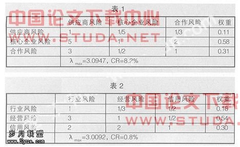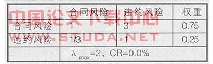 合作伙伴风险的判断矩阵同上,而合作风险的判断矩阵构建如下: