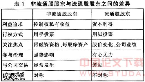 由于股权分置造成了流通股东和非流通股东在权力行使、利益追求等方面存在着诸多差异,具体如表1: