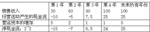 该表始于销售,从第一年的30万元直到每年稳定的100万元。下一行显示的是经营活动产生的现金流,这里省略了从销售收入到现金流的计算过程。减去营运资本后,就得到净现金流。净现金流在开始为负值,第三年后变成正值。