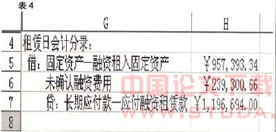 5.在单元格C4:C7中分别输入“租赁日分录:”、“借:固定资产一融资租入固定资产”、“未确认融资费用”、“贷:长期应付款一应付融资租赁款”,如下表4: