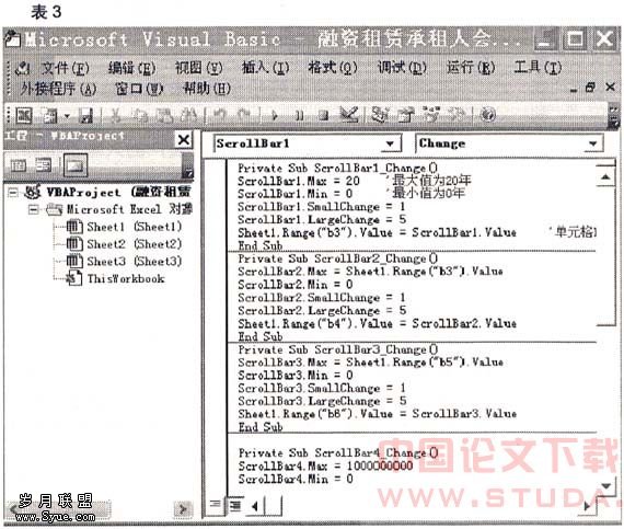 (5)在单元格ClO中添加一滚动条Scro-llBar5,其最大值小于租赁资产的账面净值与单元格B10绑定,代码如下:
