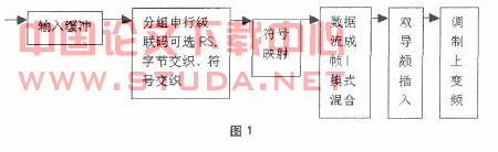 ADTB一T是一种“单载波”方案,其采用偏置正交幅度调制(OffsetQuadrate Am-plitude Modulation OQAM)采用4位或16位及32位OQAM变调方式,并在其中融入了独特的平均化技术,使用8M Hz带宽,拥有SMbit/s. lOMbitls, 20Mbit/s三种传输模式。ADTB方案的工作过程大致为:各种数据码流进入数据缓冲器,经过扰码、外编码(RS编码)、交织、内编码后,经过同步信号插入、导频插入、OQAM调制后形成基带信号,再经上变频为射频信号。图1为ADT’B-T方案流程框图。