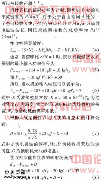 当确定了接收机的带宽B、接收机的噪声系数凡、接收机天线的定向性D(或者增益G)?便可以确定接收机能接收到的最低场强?只要大于最低接收场强的计算机电磁辐射信号均可以被接收机接收。