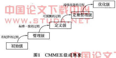 CMMI的阶段表达方式继承了CMM的思想方法。将所有的过程域依照5个成熟度等级来组织,从低到高分别为:初始级(Initial,第1级)、管理级(Managed,第2级)、定义级(Deifned,第3级)、定量管理级(QuantitativelyManaged,第4级)和优化级(Optimizing,第5级)。如图l所示: