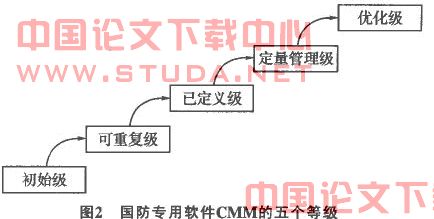 国防专用软件能力成熟度模型将组织的软件能力成熟度分为5个等级,分别是:1级称为初始级,2级称为可重复级,3级称为已定义级,4级称为定量管理级,5级称为优化级。如图2所示: