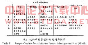 制定计划的精髓不在于写出一份好看的文档,而在于运用您的智慧去应对各种问题和面临风险并尽可能做出前瞻性的思考。计划是用来指导工作的,制定项目计划必须把握项目it~,l的粒度,粒度越细则控制力度越大,但项目管理的成本越高,反之则控制力度越小。凶此必须按照特定的项目量体裁衣,该详细就详细,该简略的就简略,制定相符的项目计划。许多组织都有项目计划制定的指导原则。例如,美国国防部的2l67标准“软件开发计划”用于指导那些为国防部开发软件的开发商制定软件开发计划。电气和工程师协会(IEEE)的1058.1标准描述了“软件项目管理计划”的主要内容。表l给出了“1EEFYI,T:,准软件管理计划”的格式。遵循那些标准和方针有利于项41汁划的制定和执行一旦it~,l被负责任地完成,他就可以给闩己一个和管理层或客户交流和协商的基础,帮助其在项目过程中防范各种题的出现,保证项H的按时完成.