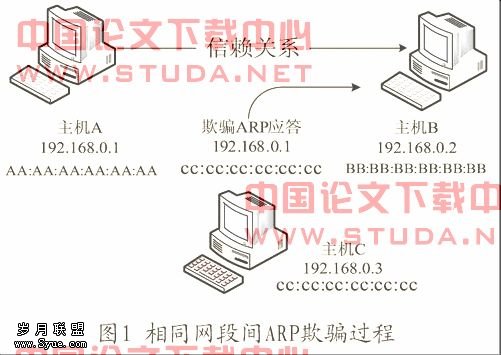 此种欺骗攻击通常会伪造一个ARP_REPLY的响应包发送给欲欺骗主机,人为指定该数据包中的源IP,目标IP,源MAC地址,目标MAC地址。通过此虚假的ARP响应包修改欲欺骗主机的ARP缓存,达到欺骗目的。以图1为例说明相同网段间ARP欺骗过程。