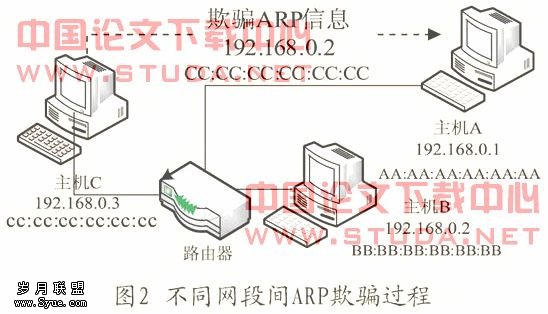如主机A与主机C在不同网段,上面的方法则不起作用。以图2为例说明不同网段间ARP欺骗过程。