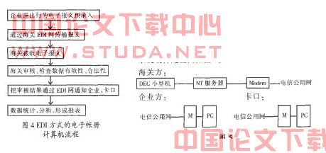 EDI(Eleotl.ioData Interchange)是一种电子数据交换方式,它通过公用电话网把客户连接起来,在一个公共的信息中心交换,达到异地、无纸化、自动化共享数据的目的。在一个EDI中心,用户用标准的报文在各自场所向EDI中心发送信息,经EDI中心分捡,送到指定的位置。对方收到信息后,对该信息进行处理.把结果发送到EDI中心,再由DDI中心分捡。EDI中心起到一个信息的存贮、交换的功能,对EDI中心的用户而言,它是一个信息采集过程。在发达国家,EDI被广泛应用在、海关等行业。在我国,目前基本上以行业形成EDI中心,海关总署已开发了EDI报关自动化系统采用EDI方式的电子帐册计算机流程见图4:要配置的软件有:VAX操作系统、PASSWORK或TCP/IP、COBOL语言、RDB数据库、DECEDI管理软件、WindowsNT、E-mail Server、OUT-mail、R-mai1。其中PASSWORK或TCP/IP用来作为NT服务器与DEC小型机的通信协议,DECEDI管理DEC上的EDI报文,E-mailServer用在NT服务器上接收邮件,OUT-mail用在NT上从邮件中抽取报文,R-mail用在PC上向NT服务器发送邮件,COBOL、RDB为开发应用的语言工具。系统硬件配置图如图5。