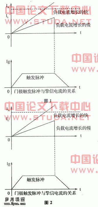 当可控硅门极触发而导通,若阳极电流IA尚未达到掣住电流IL值时,触发脉冲一旦消失,可控硅便又恢复阻断状态,若IA>IL,虽去掉门极脉冲信号,仍维持可控硅导通。对如磁选装置等的电感性负载应加以注意。负载电流(亦即阳极电流)增长的快慢对于门极脉冲消失后可控硅是否能继续导通很重要,如图(1)所示:负载电流增长快时,在脉冲未消失前,IA>IL,脉冲消失后不影响IA的流通,若IA增长慢,脉冲消失时IA