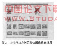 假设用户要搜索一个牡丹花的图片并且给出了关键图,根据检索结果,用户根据关键图的直方图和边缘图使用绝对值距离的方法,从图像库中检索出符合要求的图片,并从中选择满意的图片通过彩信群发器发给他的用户。其检索界面如图2所示。