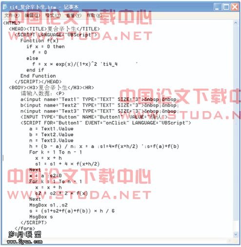 (1) 在记事本环境下,仅仅使用了一些简单的VBScript脚本语句就可以完成复杂的数值计算任务。VBScript是介于HTML语言和Visual Basic、Java等高级语言之间的一种脚本语言,它接近于高级语言的大部分功能,但却比高级语言简单易学。