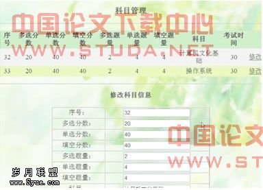 <%If editstudent = "" Then%>科目信息的修改,包括各类型题的总分和题量以及考试时间设置,其中序号和科目名称是不可修改的。用一个DataGrid控件实现了显示科目信息,以一个隐藏的Panel控件放上一个表格来绑定相应科目信息,当点击修改时,Panel控件显示,并将相应科目信息以表格形式显示,以供修改。如图4-3所示: