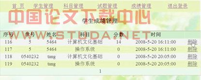 本系统采用B/S架构作为系统的总体结构,以Web数据库技术为依托,利用微软的ASP.NET技术,结合ADO,实现了对Web数据库的访问和查询。该设计实现了按题型随机抽题组卷、在线考试、题库管理、系统管理的功能,能够对客观题在线评分。学生用学号登录成功后,阅读考试须知,之后选择考试科目进入考试页面,完成相应科目考试,自动给出考试成绩。系统管理,实现了对题库、考生信息、考试成绩、考试科目的管理。题库管理,实现了对试题的添加、编辑、删除功能;考生信息管理可以添加、修改、删除、查询考生信息,成绩管理可以删除成绩信息,科目管理主要是修改考试科目信息。