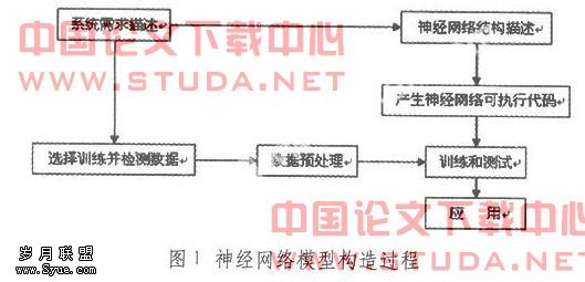 运用神经网络方法建模的一般过程包括确定系统需求描述、选择神经网络模型(包括神经网络结构、训练方法等)、数据预处理、确定神经网络的可执行代码、训练和测试等过程,具体情况见图1。