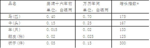 从上表可知,到万历年间,马市商税税率,最多的要比嘉靖十六年前增加三倍。此外,明朝政府的官吏在马市贸易中还要“强抑市价”[35],使女真族倍受经济损失。如弘治十二年,“广宁、开原、抚顺三马市,每遇夷人持马,貂诸物来市,被势家镇守等官纵令头目仆从减价贱市,十偿三四,夷人受其挫勒,扦阅积久,怀怨殊深,往往犯边”[36]。明朝官吏对女真族的掠夺,曾迫使他们多次起兵反抗,但结果往往遭到明朝官兵的镇压。万历四十六年(1618年),女真族后金国汗努尔哈赤率兵攻明之前,发布“七大恨”以誓师。在“七大恨”中,努尔哈赤针对明朝辽东官兵横行马市,勒买人参,强征貂皮的掠夺行经,义正辞严地指出:“文武边官,欺诳壅蔽,无怀柔之方略,有势力之机权;势不使尽不休.利不括尽不已,苦害侵凌,于态莫状”[37].所以,封建专制主义国家政权对民族贸易的蛮横干预,是阻碍民族贸易发展的羁绊。