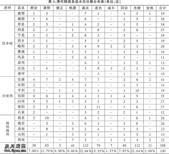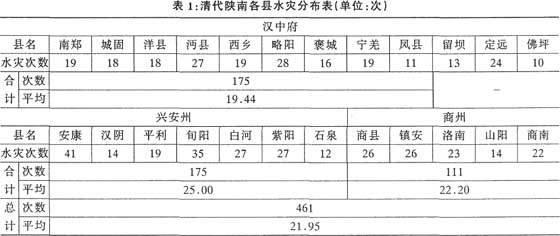 (1)资料中的灾情记载,明确注明某县,则视为该县发生水灾一次;所谓的“陕西”灾害,除非见到各地所属州县的具体记载,否则不在内,例如,“康熙三年,陕西,被水”,我们将不作为一次记载;而“陕南”灾害,则陕南所属州县分别按一次计算在内,例如,“嘉庆十八年,陕南,兴、汉、商各属秋涝(多雨),稻苗半槁,年岁大荒”;另诸如“南山一带,七月间,阴雨过多”、“汉水,七月十四日大水”等这样模糊记载,由于很难确定具体所属各县,我们在统计中将不计算在内。