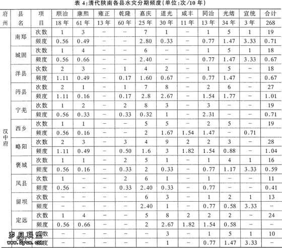 由表4可知,发生灾害频率较高的地区为安康、旬阳、略阳、沔县、白河、紫阳、商县、镇安,这些州县的海拔也相对较高,而城固、洋县等海拔较低的河谷盆地则频次较低。就时段看,各个县在嘉庆和光绪这两个时期变化最为明显,水灾暴发的频次提高较快,是历年平均频次的几倍,相对其它时期更为集中。这既与气候波动一致,又与移民入迁的高潮吻合。