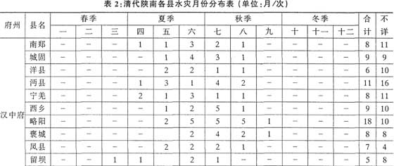 由表2可以明显看出,清代陕南地区的水灾主要发生在夏秋两季,分别占52.76%和42.82%,其中又多集中在农历五、六、七月之中。洪涨期最早是在夏季四月,最迟在仲秋九月,冬季则为低水位时期,几无洪水发生。这一统计与自然科学工作者根据水文仪器对1934—1940年汉中盆地汉江洪涨季节的测量统计分析基本上是吻合的。据统计1934—1940年汉中盆地汉江的洪涨期起于五月,终于十月,以七、八两月次数最多;就季节而言,夏季最多,达到十次,秋季五次,春季一次,最少。[63]因此可以说,根据文献记载的统计分析,其可信度是很强的。