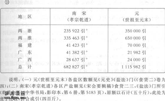 元代盐的生产规模是很大的。从产盐的地区来说,北起辽阳,南迄岭海,旁及四川、河东等地。在这些地区,共设有盐场一百六十六所⑥,(后合并为一百三十七所⑦)以从事生产的人数来说,固定的专业劳动者共有五万二千余户⑧,此外国家还经常发配罪犯到盐场服役,参加生产。从产量来说,世祖末年全国盐产额达一百七十余万引(每引四百斤)⑨。以其中南方各盐区产额与南宋比较,有很大增长⑩(北方因金代缺乏具体数字,无法比较)。到了元中叶,总产量更激增至二百六十万引左右。