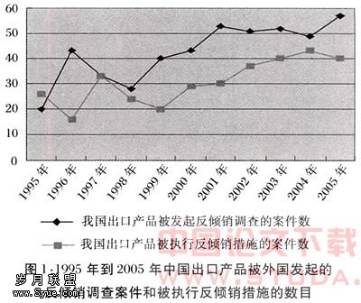 改革开放20多年来,我国经济建设取得了令世人瞩目的成就,GDP增长创造了连续15年保持7%以上的经济奇迹,进出口总额从1978年的108.9亿美元增长到2005年的14221亿美元。加入WTO以来我国的国际贸易更是迅猛,进出口总额于2004与2005连续两年突破10000亿美元,其中2005年贸易顺差达到了1018.8亿美元,成为世界第三大贸易国。机会与风险并存,随着我国对外贸易的快速增长,对外经贸磨擦日益频繁,我国产品遭受外国的反倾销愈演愈烈。由图1看出中国出口产品遭受外国反倾销立案调查和被执行反倾销措施的数量从1995年至2005年总体呈现上升趋势,从数量增多的背后进一步分析得出我国出口产品遭受的反倾销呈现以下特点: