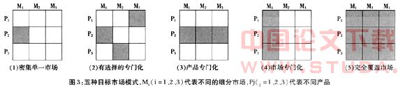 如图3,密集单一市场(1)是以单一产品对单个细分市场密集营销的市场模式;有选择的专门化(2)是以多种产品对多个联系很少的细分市场分散营销的市场模式;产品专门化(3)是以系列同种产品对不同细分市场展开营销的市场模式;市场专门化(4)是以一系列多种产品满足某个顾客群体各种需要的市场模式;完全覆盖市场(5)是用各种产品满足多个顾客群体需要的市场模式。我国出口企业往往不重视对市场覆盖策略的研究,沿用“大规模分销”的传统方式,出口主要集中在为数不多的标准化产品上,因而这些商品在进口国市场上所占份额就相对较大,同时我国商品的现实优势又在于价格低廉,这样即使不是有意构成倾销行为,也容易引起进口国同类产品厂商的警戒并引发反倾销申诉。考虑到我国大部分出口企业规模小、国际市场基础不够深厚,密集单一市场(1)和有选择的专门化市场(2)模式较利于我国出口企业进入国际市场,而且有利于避免国外的反倾销。市场定位就是出口企业确定在目标国际市场要传递的顾客价值,也就是企业或品牌的核心观念。我国出口企业的市场定位要注重价值的差异化,即在设计产品与形象时以目标市场的顾客利益为基础,充分体现自身优势,努力避免与国外竞争者雷同,从而在目标顾客心目中占有一个独特的位置。定位之后,要通过产品、价格、渠道和促销的差异化来体现核心观念,从而将出口产品与国外竞争者区分开来。