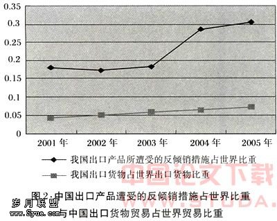 (三)遭受的反倾销措施与出口贸易量极不相称如图2显示,从2000年至2005年,中国出口产品被执行反倾销措施数目占世界的比重逐年上升,同时看到虽然中国出口贸易占世界贸易的比重也在上升,但前者始终远远高出后者,二者极不相称。中国出口产品已经连续11年遭受到世界最多的反倾销调查,中国已成为反倾销的最大受害国,而且这一不祥趋势还在延伸扩大。