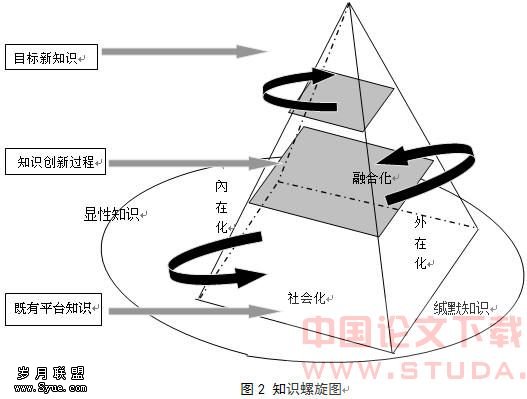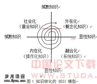 野中郁次郎(Nonaka Ikujiro)认为缄默知识与显性知识之间是可以互动转化的,是一个永无休止的循环过程,并提出了知识转化的四种模式,简称为SECI模型“SECI”模型( the SECI Model)(图1):(1)社会化(Socialization),从缄默知识到缄默知识,也是个体交流共享缄默知识的过程。用“社会化”一词主要是强调缄默知识的交流是通过社会或团体成员的共同活动来进行的。最常见的就是工厂和学校中惯用的“师徒模式”。(2)外在化(Externalization):从缄默知识到显性知识。通过努力,个体可以在一定程度上将缄默知识转化为显性知识,并将之传授给他人。外在化是知识创造的关键,因为知识的发展过程正是缄默知识不断向显性知识转化和新的显性知识不断生成的过程。这个过程常需要使用一定的技术来帮助个体将自己观点和意象外化成为词语、概念、形象化语言(如比喻、类比或描述),或者图像。(3)融合化(Combination)。从缄默知识到显性知识,是一种把概念综合成知识系统的过程。这个知识转换模型包括组合不同显性知识躯体。个人抽取和组合知识的方式是通过、会议、电话交谈等媒体,或机通信来实现学校中的教育和训练通常采用这种形式;(4)内在化(Internalization):从显性知识到缄默知识,是把显性知识应用为缄默知识的过程。内内在化意味着新创造的显性知识(组织知识)又转化为组织中其他成员的缄默知识。经过融合过程,新知识得以在组织成员间传播。组织中的成员接收了这些新知识后,可以将其用到工作中去,并创造出新的缄默知识。内内在化与通过做来学习密切相关,是一个“干中学”(learning by doing)和“用中学”((learning by using)的过程。这四个模式互为一体、相互转化,共同构成企业组织知识创新与积累的机制。野中郁次郎(Nonaka Ikujiro)知识是在缄默知识和显性知识的转化中形成了一个不断成长的知识螺旋(图2)。他认为组织知识创造是缄默知识和显性知识持续互动的结果,组织本身不能创造知识,个人的缄默知识是组织知识创造的基础。缄默知识经过社会化、外在化、融合化和内在化四个阶段,实现了个人之间、个人与组织之间知识的传递,并最终又产生了新的缄默知识。知识的转化、传递和创造是一个动态的、递进的过程,当个人的缄默知识完成一次知识螺旋运动并转化为新的缄默知识时,就开始了新一轮的知识螺旋。