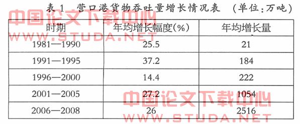 (1)吞吐量持续高速增长。“八五”期间平均递增速度为37.2%,打破全国沿海各港发展记录,“九五”和“十五”期间继续以两位数的递增速度增长。鲅鱼圈港区及港区深水泊位的建设极大地适应了腹地经济发展的需求。