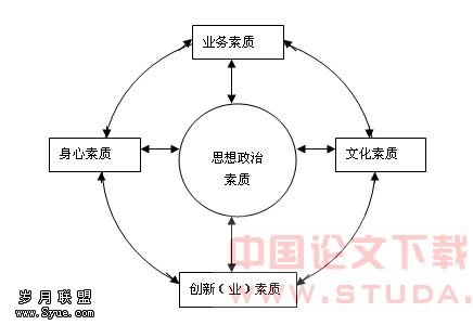 从上图中看出,思想政治素质教育作为中心,它是整个素质教育体系的灵魂。横向上看,大学生身心素质和文化素质随着年龄的增长和受教育层次的提高及社会环境的影响都会发生变化;纵向上看,大学生业务素质教育体现在专业教育方面,为他们从事创新或创业奠定专业基础。但在大学素质教育过程中应加强与思想政治素质教育的融合,使他们成为祖国建设的真正人才。图中显示,大学生素质教育是一个系统工程,在这一体系中各要素之间相互联系、相互配合、相互作用、共同发展,最终才能实现对大学生综合素质的培养。