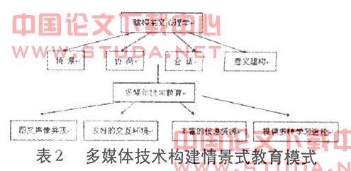 多媒体技术具有集成性、交互性、非线性等特点,所以将其运用于教育中是信息时代教育的发展趋势。多媒体情景式教育模式将机硬件、软件、外设、教学课程与通信设施有机地结合,用以提供包括文本、图形、声音、动画、视频、数据和其它各种形式的多媒体内容。在计算机硬件(如工作站)中不仅有用于通信和管理的软件工具,还有帮助用户查询和搜集信息,以及对信息进行分析处理和重新分类的软件工具。还有根据教学目标以及学习者的特点和需要而专门编制的教学方案和教材,以及将学习材料组织成符合一定教学模式和教学策略要求的课件。学习者也可把教案、教材和课件拷贝到自己的工作站上存储起来,供以后随时使用。随着交互技术的进展及智能系统的使用,多媒体情景式教育系统还能对整个教学过程进行跟踪,例如,根据学习者学习情况以及他们的优缺点来改进教学,使之更适合特定学习者的需要。