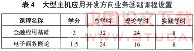 对于大型主机应用开发人员而言,不单单要掌握大型主机应用程序开发的技能,还必须对相关业务有一定程度的了解。根据目前大型主机应用多集中在行业的特点,我校在大型主机应用开发方向增设了一些与金融业务相关的业务基础课程,如表4所示。