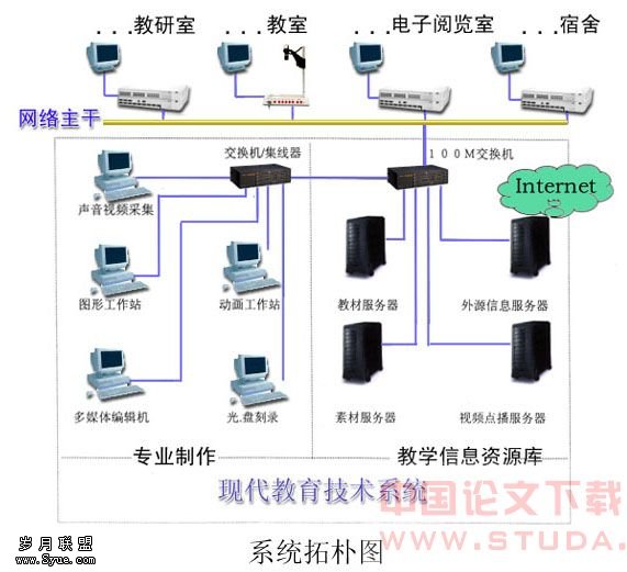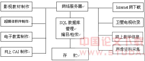 “网络教学系统”由硬件和软件两大部分构成。硬件系统主要由制作平台,教学信息资源库、教学信息网(校园网)、用户终端(网络视控器)四个部分组成。见系统示意图(图1)。