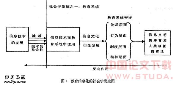 根据上面的“教育信息化的社会学发生图”,我们再来作进一步的分析。在作为社会子系统之一的教育系统的外部,信息技术的发展是教育信息化发展的源头。没有信息技术的发展,教育信息化就成了无本之木,无源之水。而从信息技术的发展到信息技术在教育系统中的应用,这是一个技术社会化的过程。所谓技术社会化,指的是“在社会的整合与调适下,使技术成为社会相容技术的过程”[6 ] 。我们所追求的是对信息技术在教育系统内的合理使用,也就是信息技术的良性社会化。另外一个方面,信息技术对教育系统的影响是一个渗透过程。谈到“渗透”,我们会提及“信息渗透理论”。加拿大GAMMA 小组和基蒙·瓦拉卡基斯把“信息渗透”定义为:“所有领域内的人类活动,包括农业、工业、商业和通信业,越来越被高技术信息机器所渗透或取代的过程。”接着,他们对这个定义还有三点阐释:第一,是他们认为最为重要的一点,信息渗透过程不只是局限于通信活动;第二, “渗透”意味着信息技术以某种方式介入人类活动,其介入程度甚至可以达到完全取代人类;第三,渗透活动须由信息技术或机器完成[7 ] 。对以上的界定和解释,我们认为有一点必须在我们研究的基础上加以改正,那就是所谓的高技术信息机器,无论它多么尖端,它只是对已有的人类活动有程度不同的渗透,而不会完全取代人类的作用。虽然在某些领域某些活动已经高度智能化了,甚至完全取代了人类,但从总体上看,人类完全被信息技术取代是不可能的。还有,我们需要强调的一点是,信息技术与教育系统之间,不只是信息技术对教育系统的渗透和影响,在另外一个方面,教育系统会反作用于信息技术的发展。教育系统本来就是信息技术的一个重要研发基地,从这种意义上讲,教育尤其是高等教育会对信息技术产生直接的影响;另外,教育系统的文化与文明也会反作用于信息技术的发展。