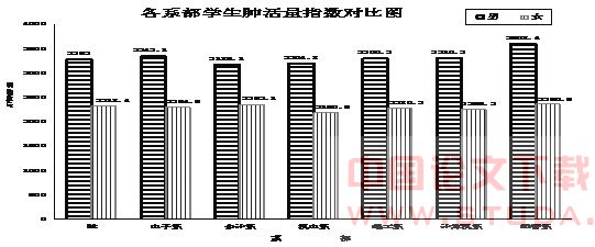 肺活量主要反映人体呼吸系统的功能,肺活量主要受身体、体重及胸围等因素的影响。从图2可以看出,学院男生的平均肺活量为3292ml,而女生的平均肺活量为2318.4ml,这种成绩基本上处于及格水平,测试结果最好的男生为经济管理系,其次为电子工程系,平均成绩分别为3608.4ml、3345.1;而女生分别为经济管理系和系,平均成绩分别为2360.8ml、2353.1ml。测试成绩最差的同学仅得到了200ml,这就要求一线体育教师在平时上课给予正确的指导。