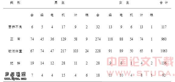 图1结果表明,院学生呈现出一个不可忽视的问题,较低体重的人数为1063个,占测试总人口的44.89%。营养不良的人数为117人,占整个比重的4.94%,这与学生没有良好的生活习惯以及在膳食中没有合理的饮食结构和时间有着很大的关系。超胖体重人数为92人,占整个比重的3.89%,存在这种情况,确实令人担忧。