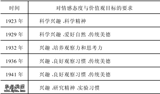 1923年的《新学制课程纲要初级中学课程纲要》提到“使知自然界与人生的关系;养成研究科学的兴趣”,其中“养成研究科学的兴趣”这种提法在之前关于情感态度与价值观目标的描述中是前所未有的。而同年的《新学制课程纲要高级中学公共必修的科学概论课程纲要》规定得更为详细,目标上提出“注重科学精神及方法,以矫正吾国自来为学弊病;多叙科学发达史,以补科学智识之缺乏;略阐科学上重要概念,以引起学生研究趣味”,并且在内容和方法上首次提到:“科学精神:求真、尚实、贵确、存疑”,这些都标志着我国中学化学课程初次注意到了情感态度与价值观目标。1929年《初级中学理化暂行课程标准(分科的)》中提到“养成研究科学的兴趣;养成随时随地能注意自然现象与事物的良好习惯;使受自然科学的陶冶,能领悟精勤,诚实,敏捷,组织等诸美德,是成功事业的基础”。之后的1932年、1936年、1941年等颁布的课程标准中都提到相类似的内容(见表1)。